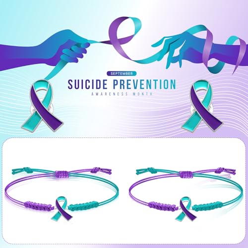 60 Pcs Purple Teal Suicide Prevention Awareness Accessories Include 30 Braided Bracelets 30 Ribbon Pins Mental Health Suicide Prevention Gifts for Women Cancer Survivor Jewelry